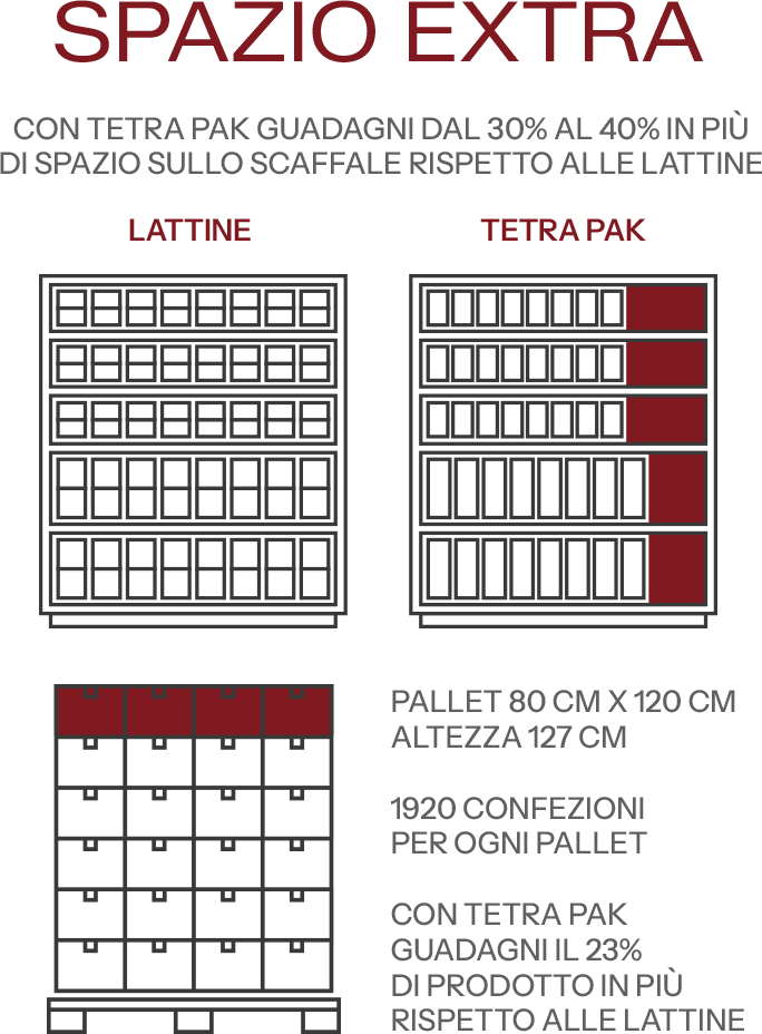 La linea Tetra Pak assicura elevata versatilità grazie alla disponibilità di diversi formati. L’intero processo produttivo, dalla formatura alla saldatura fino al riempimento, è integrato in un’unica linea automatizzata ad alta efficienza.